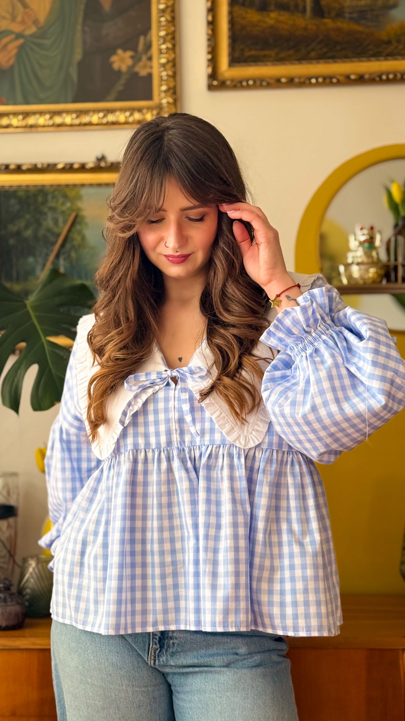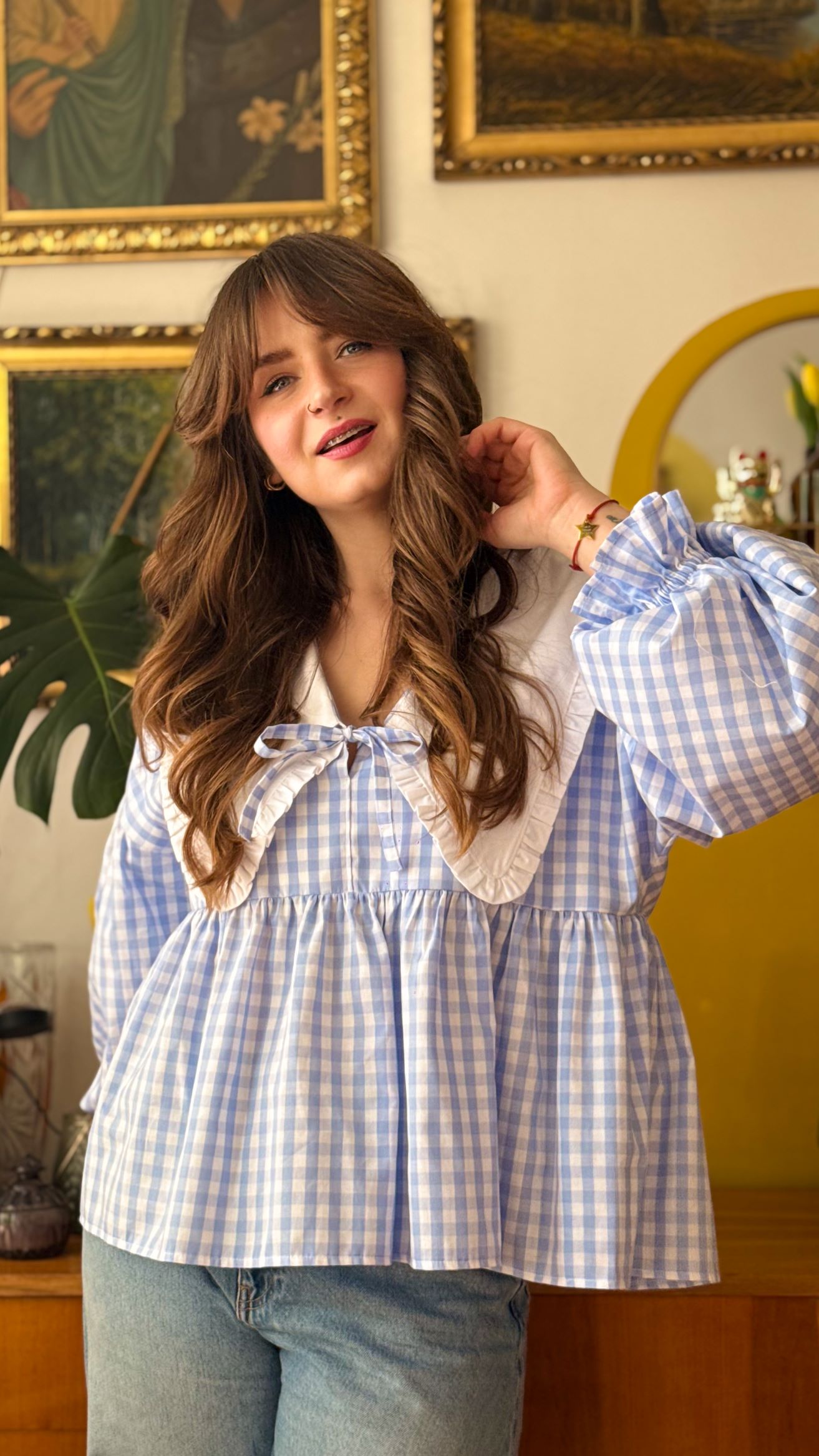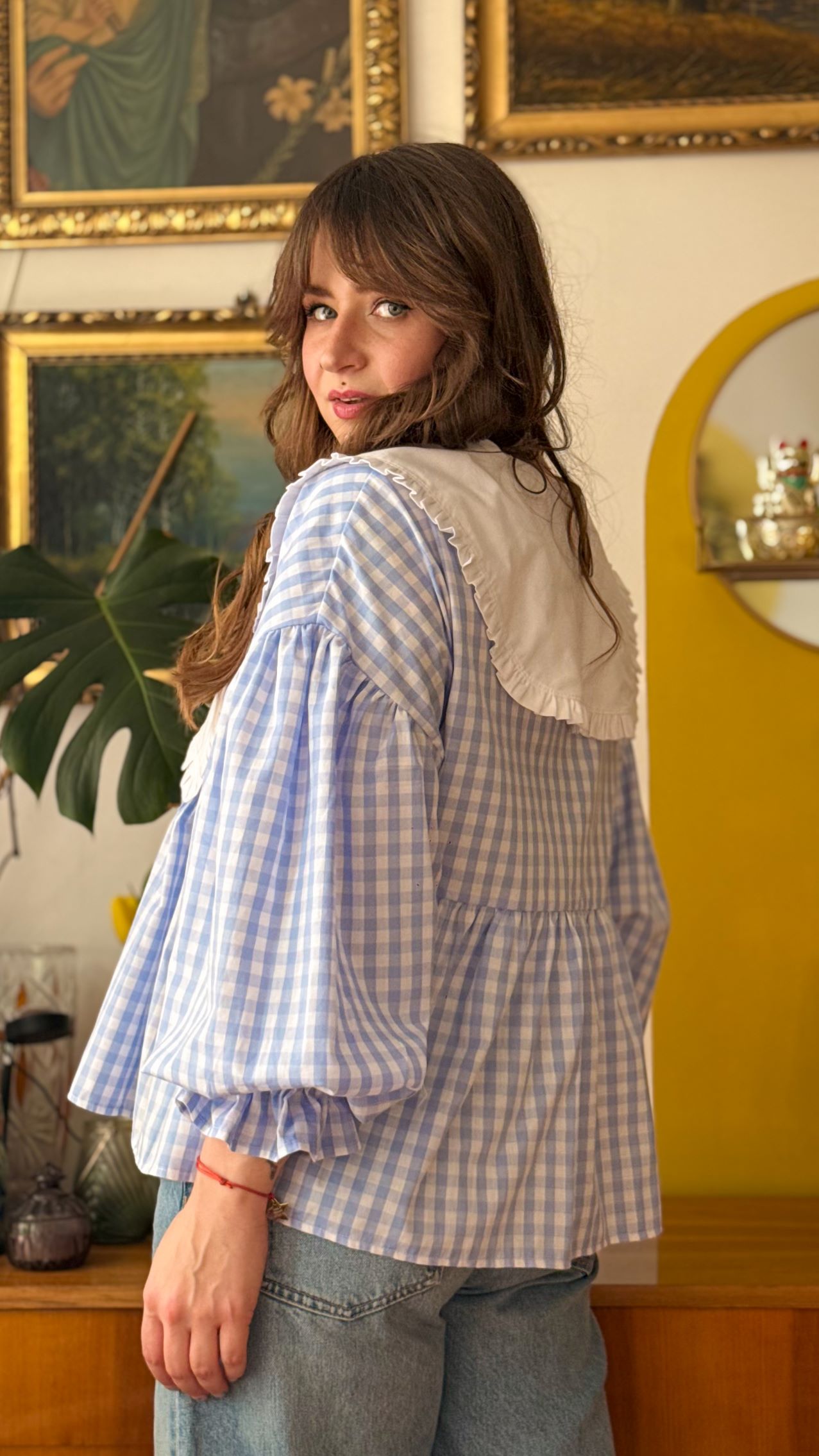 Koszula Jakaś Błękitna wykonana została z przyjemnej w odczuciu popeliny bawełnianej w błękitną kratkę z dużym białym kołnierzem.