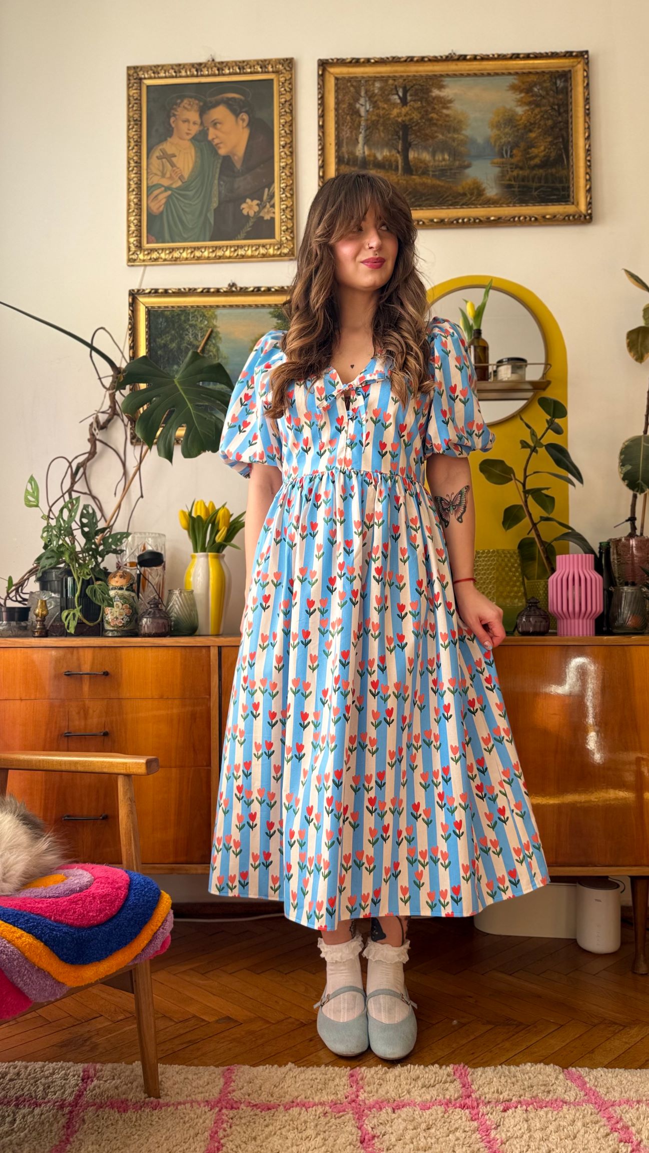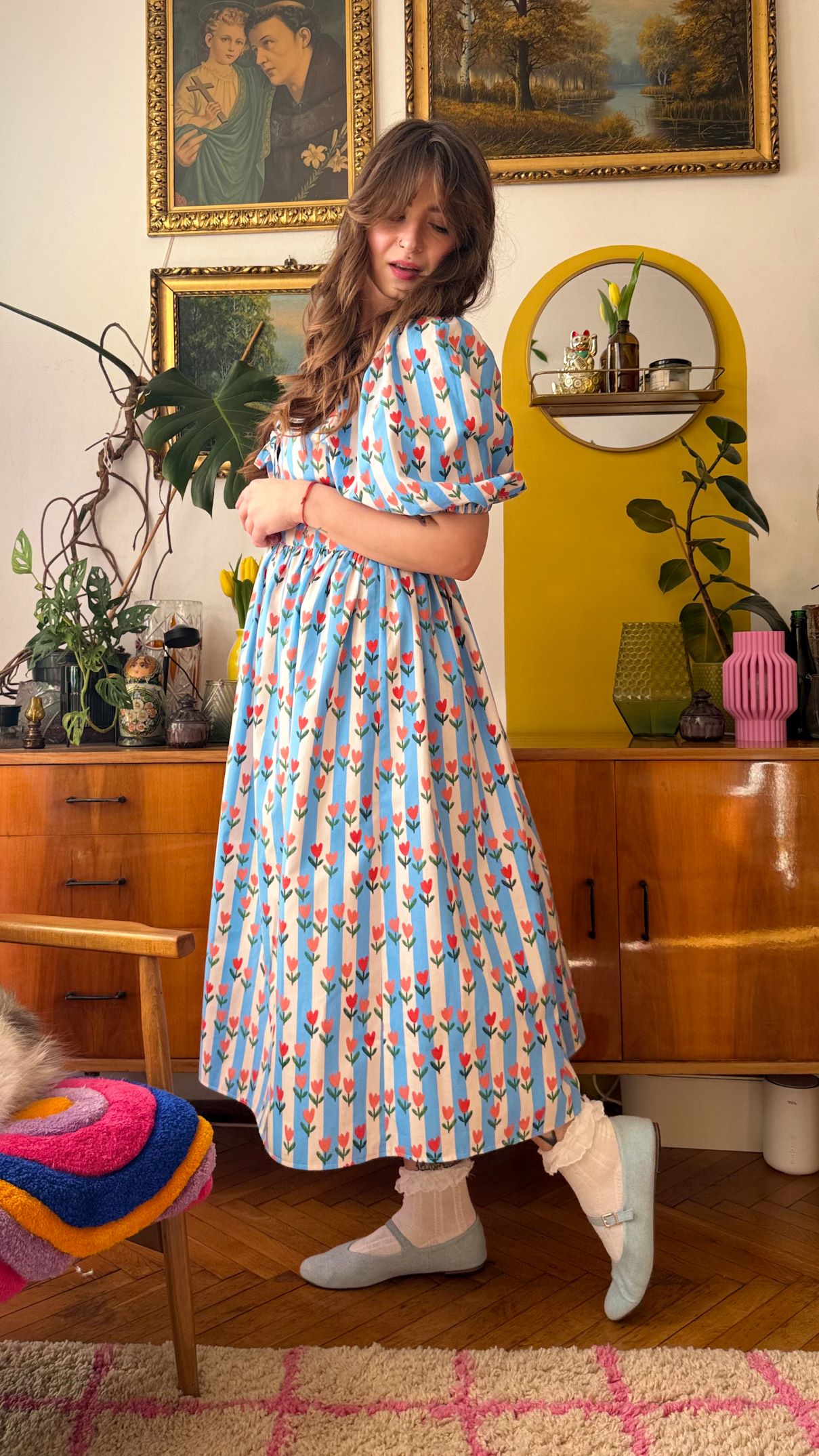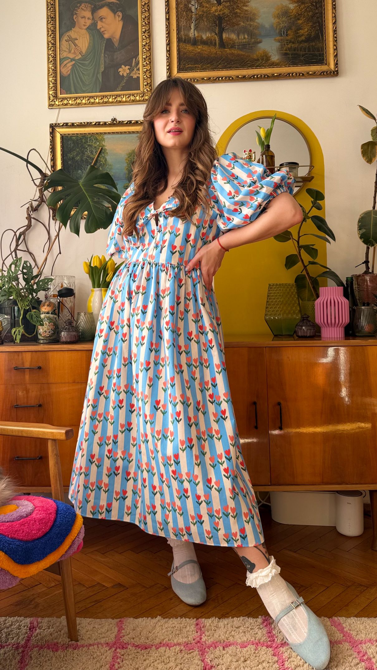 Wykonana ze 100% bawełny drukowanej w biało niebieskie pasy, a na nich dwukolorowe tulipany.