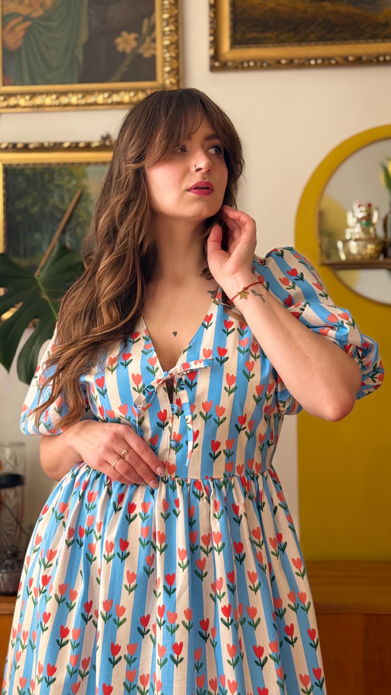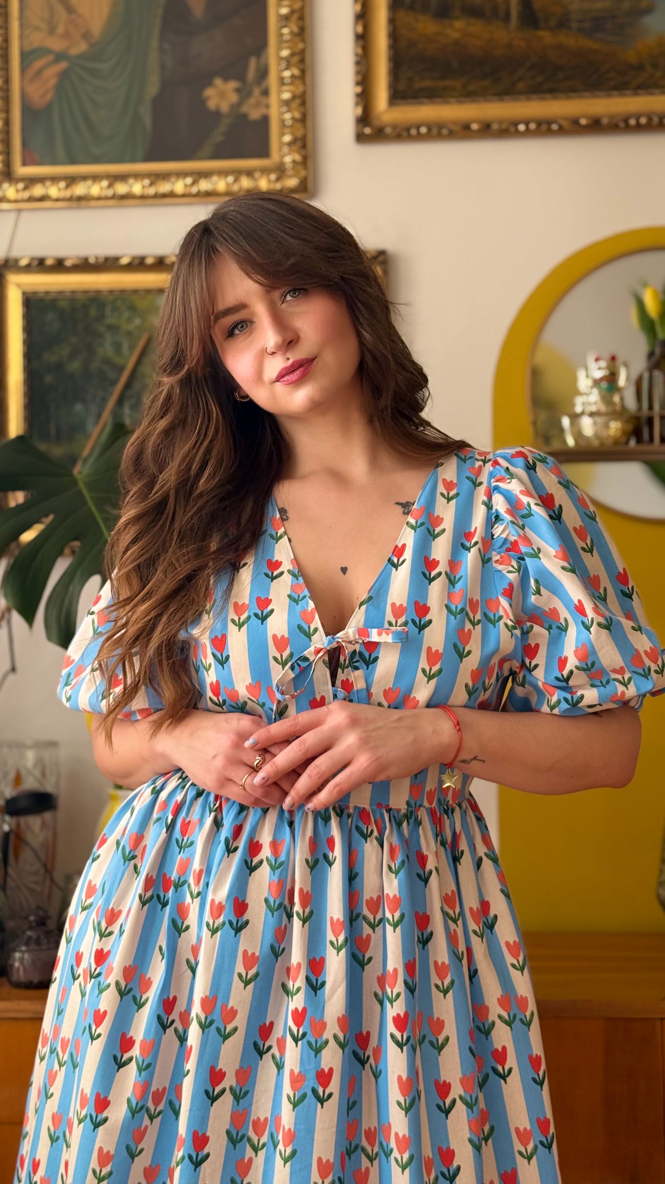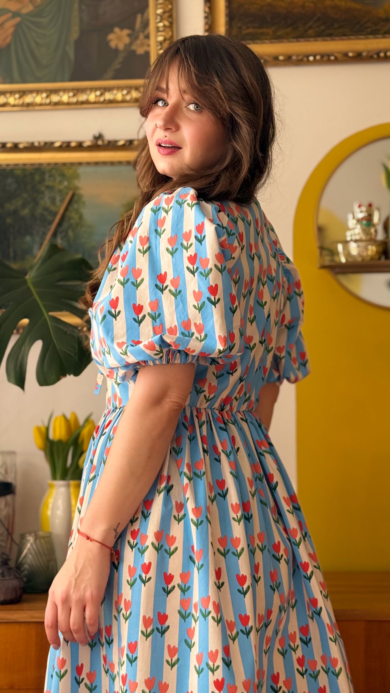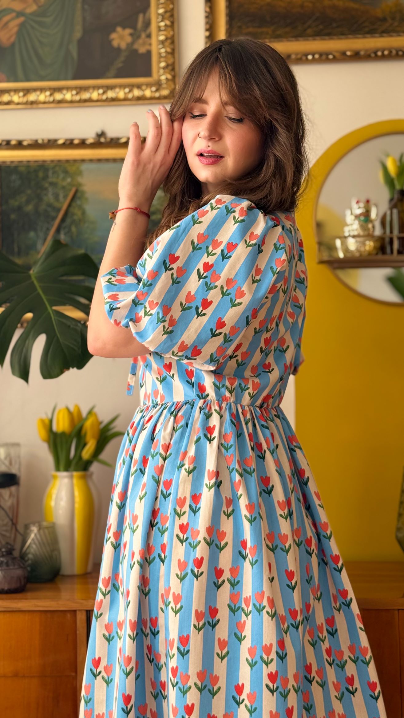 Wykonana ze 100% bawełny drukowanej w biało niebieskie pasy, a na nich dwukolorowe tulipany.