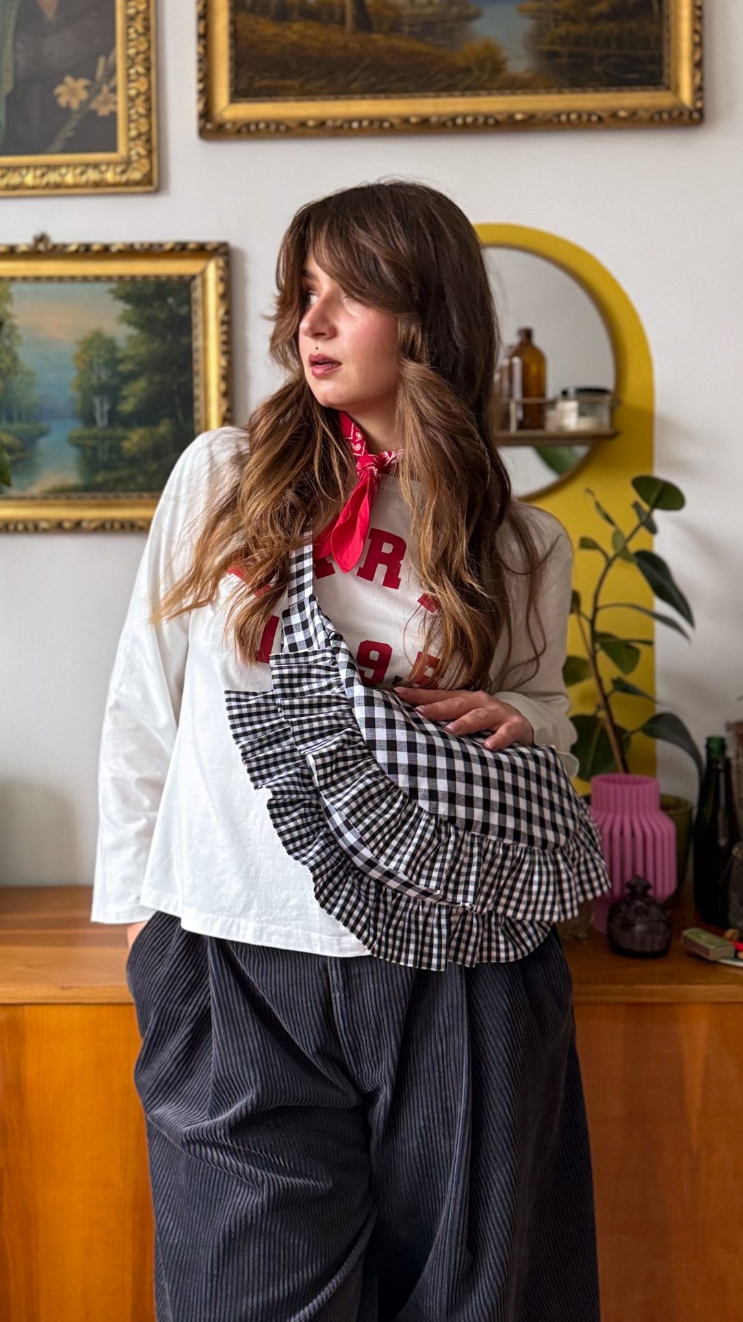 Niewątpliwym atutem tej torebki są sporych rozmiarów falbanki w drobną krateczkę.