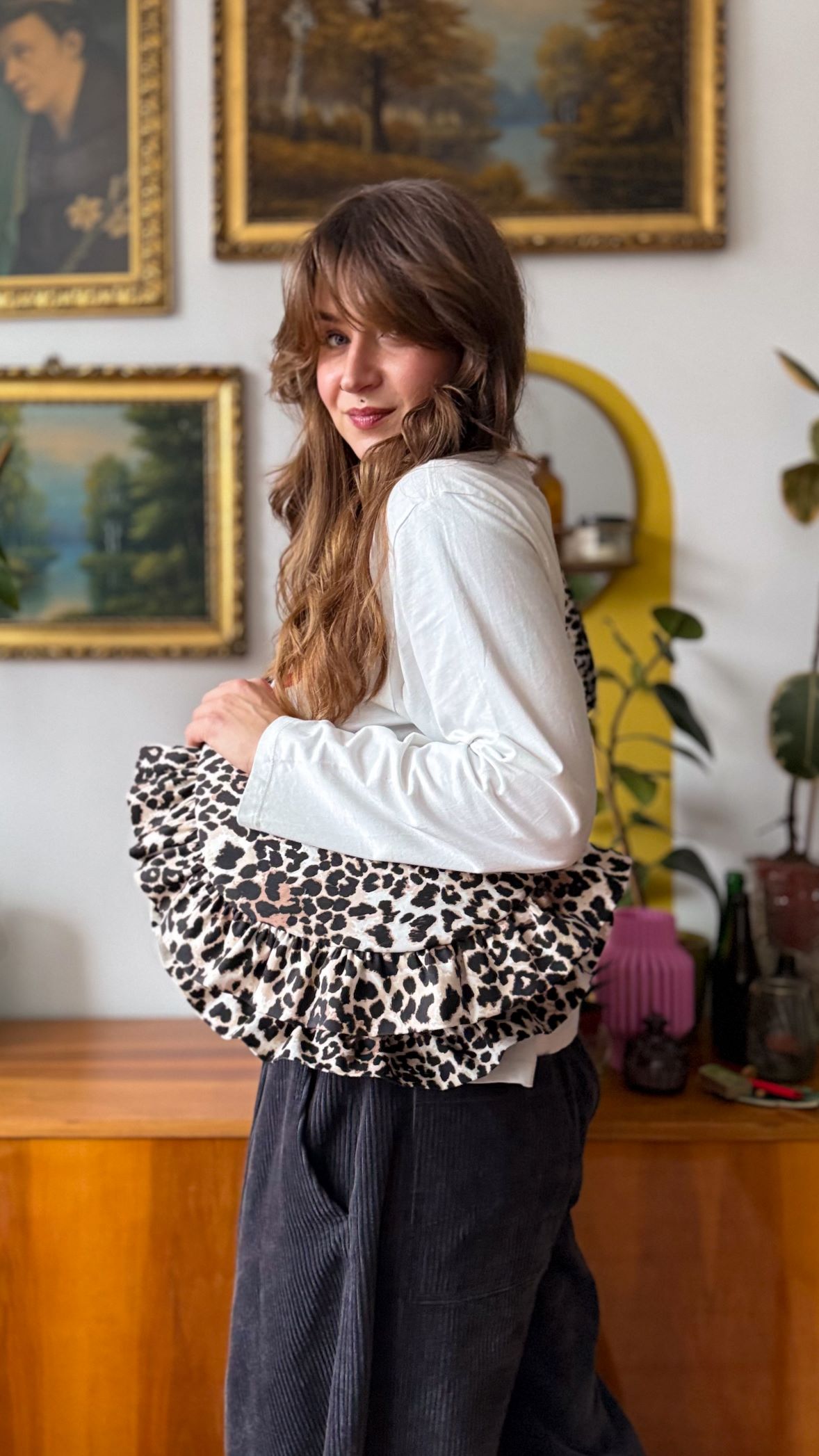 Torebka Rogalik wykonana została z bawełnianej tkaniny jeansowej w panterkę
