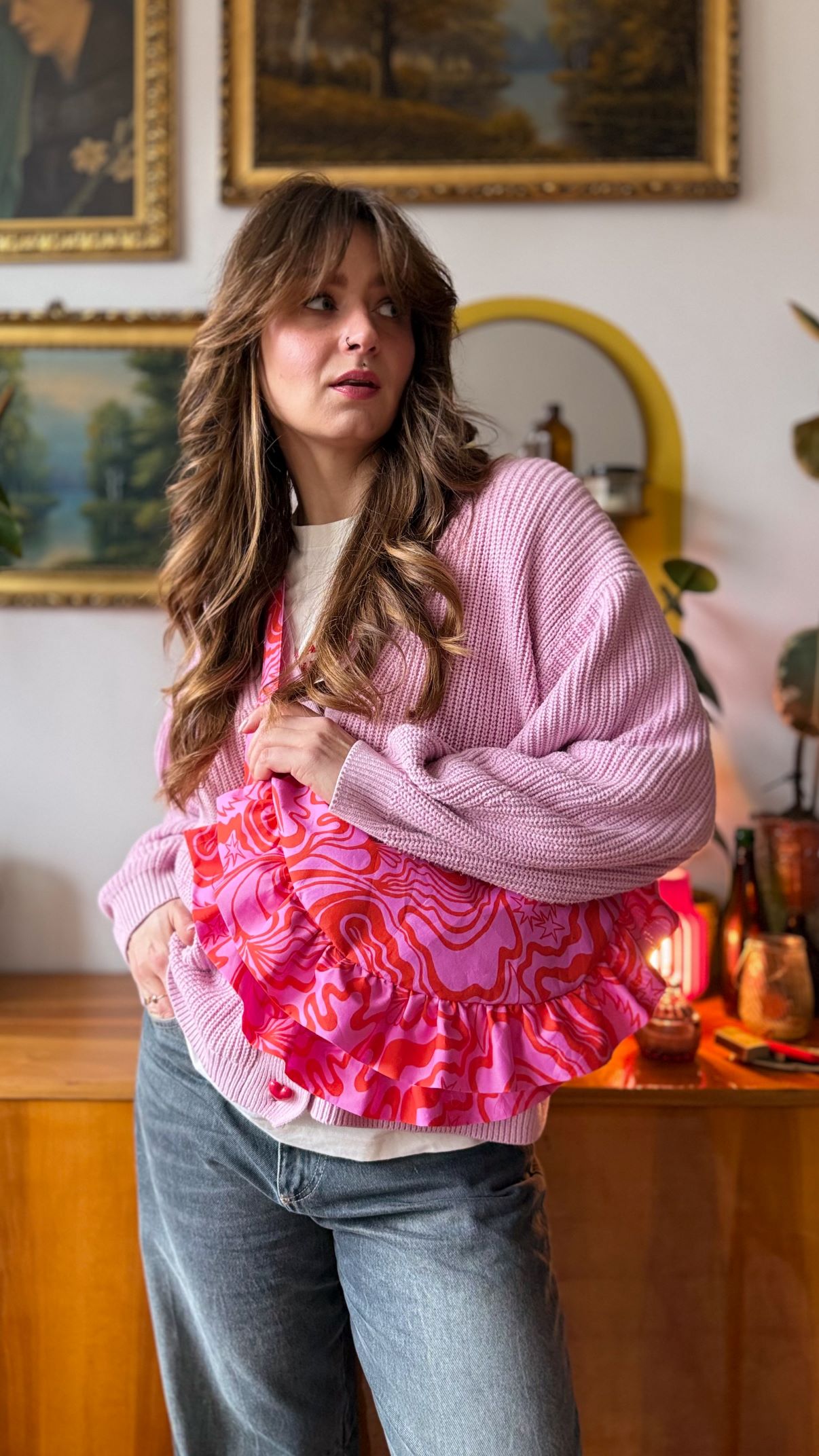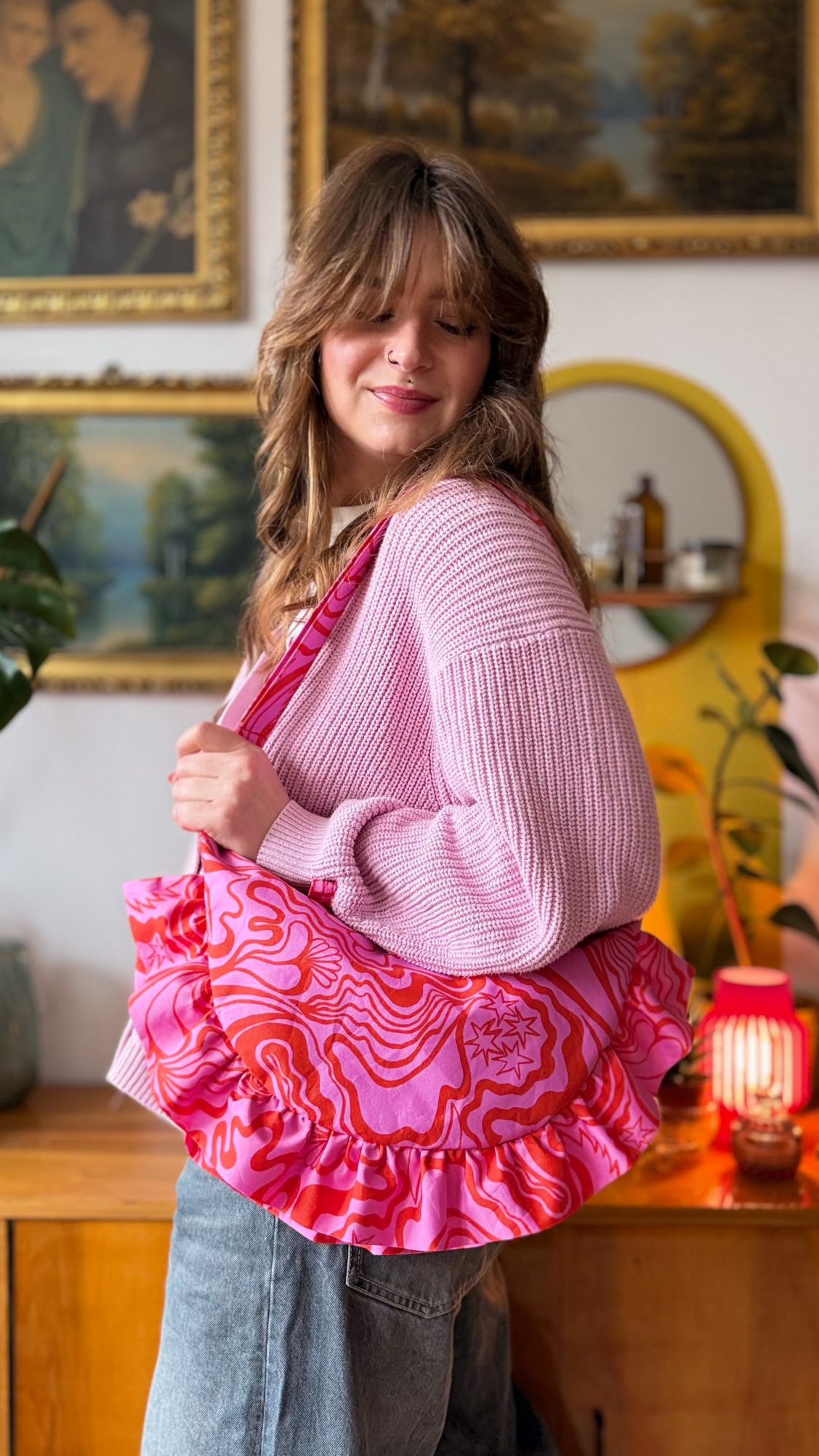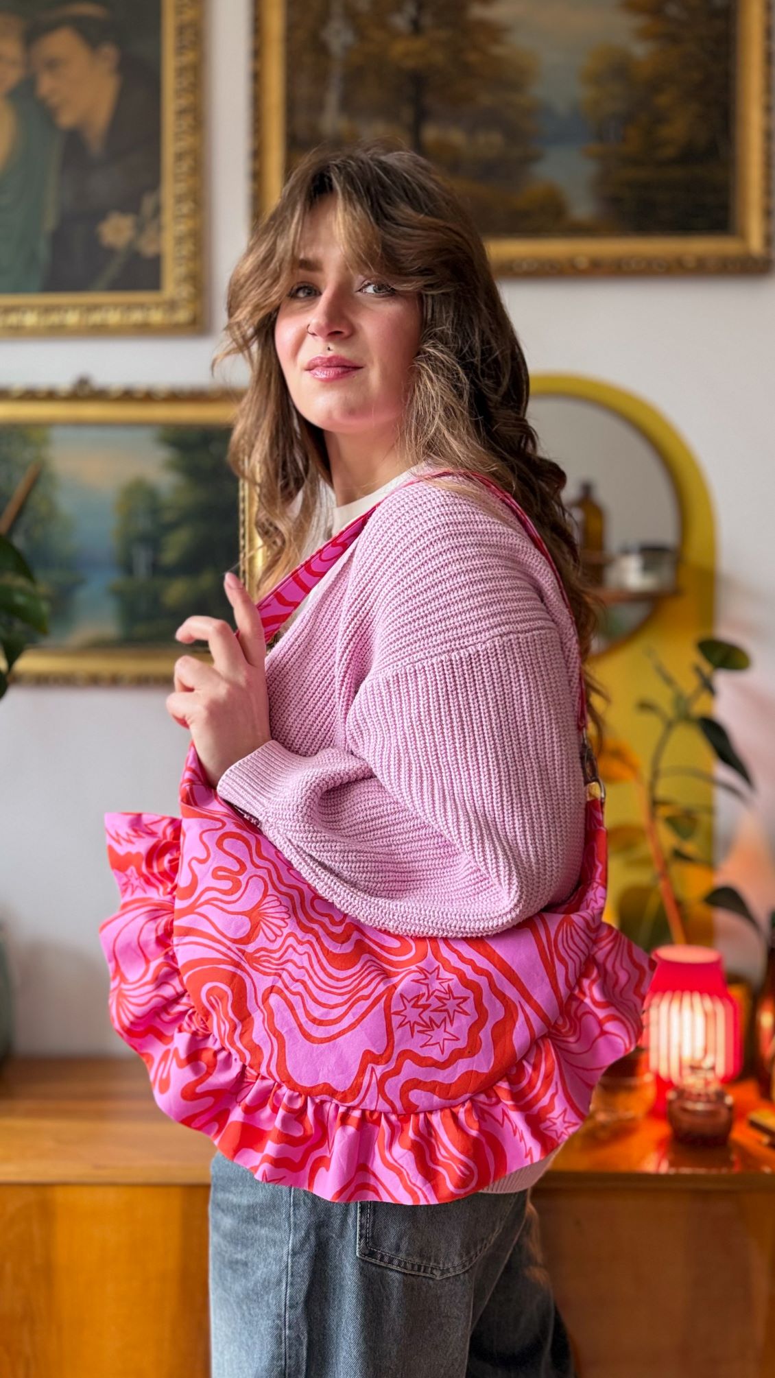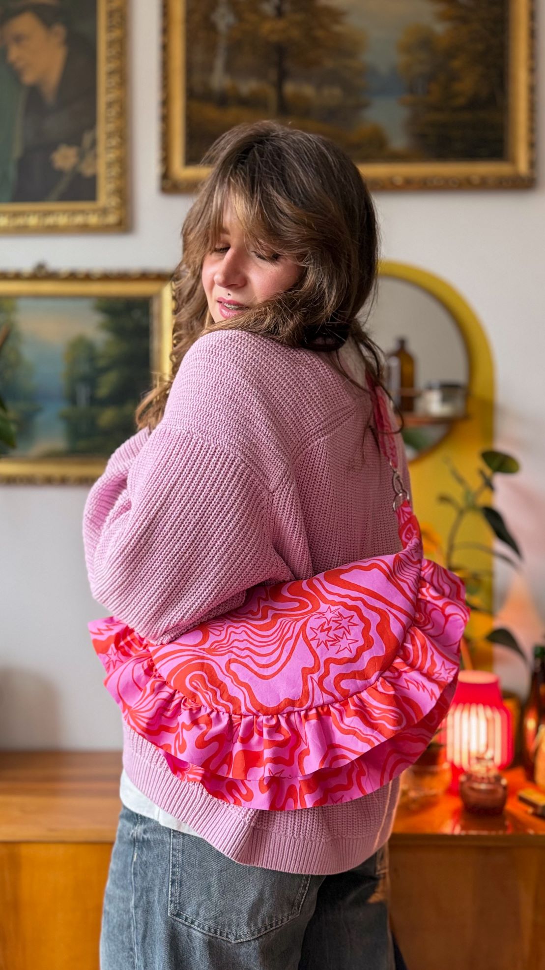 Torebka Rogalik wykonana została z bawełnianej tkaniny w w abstrakcyjne wzory w kolorach różowo-czerwonych.