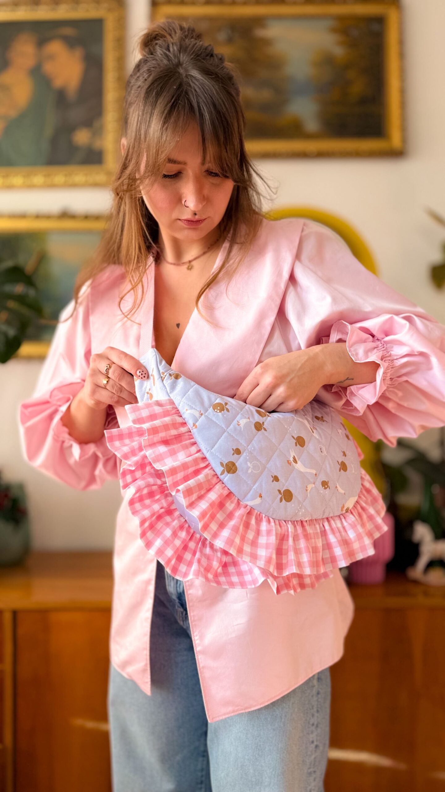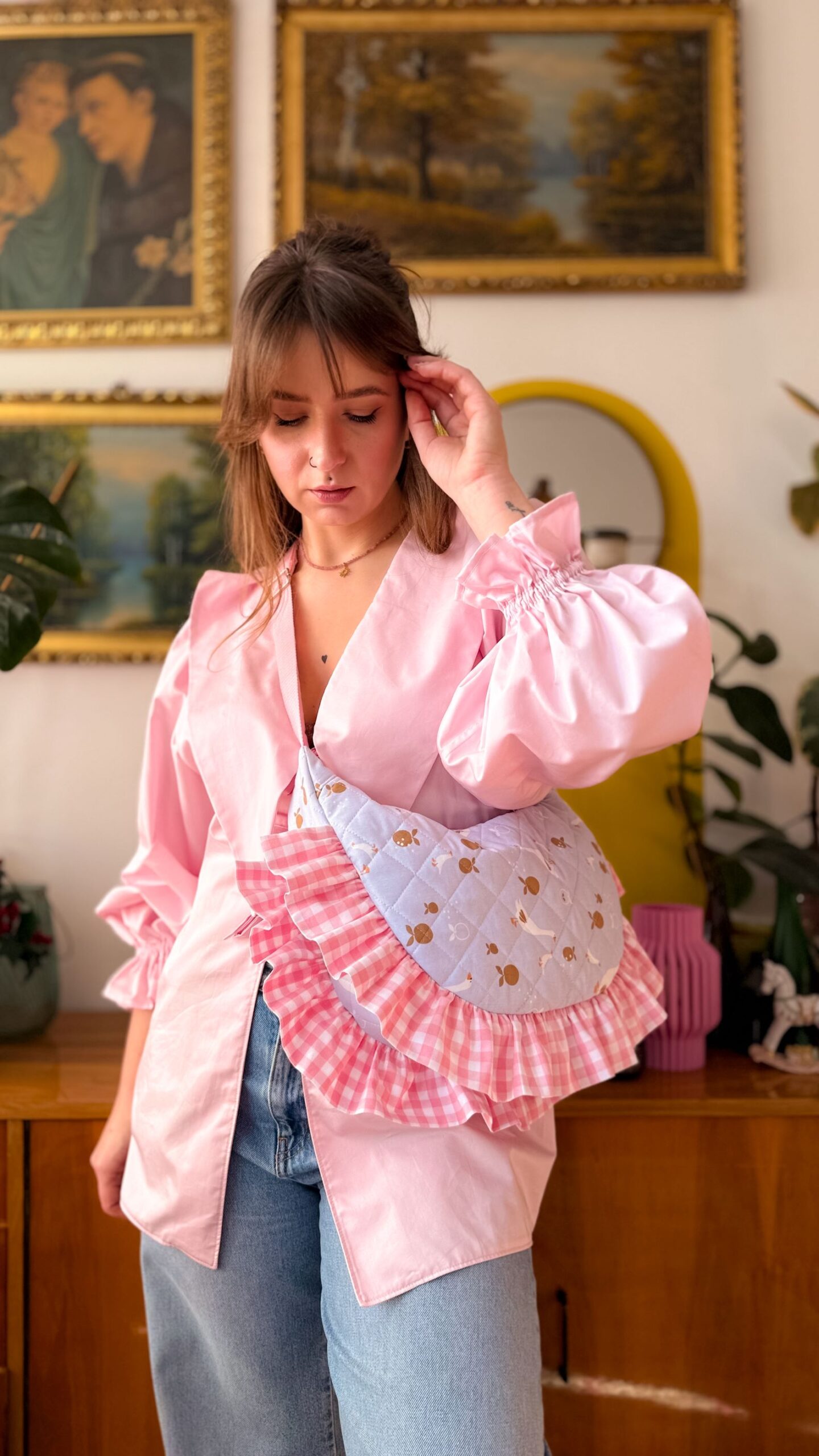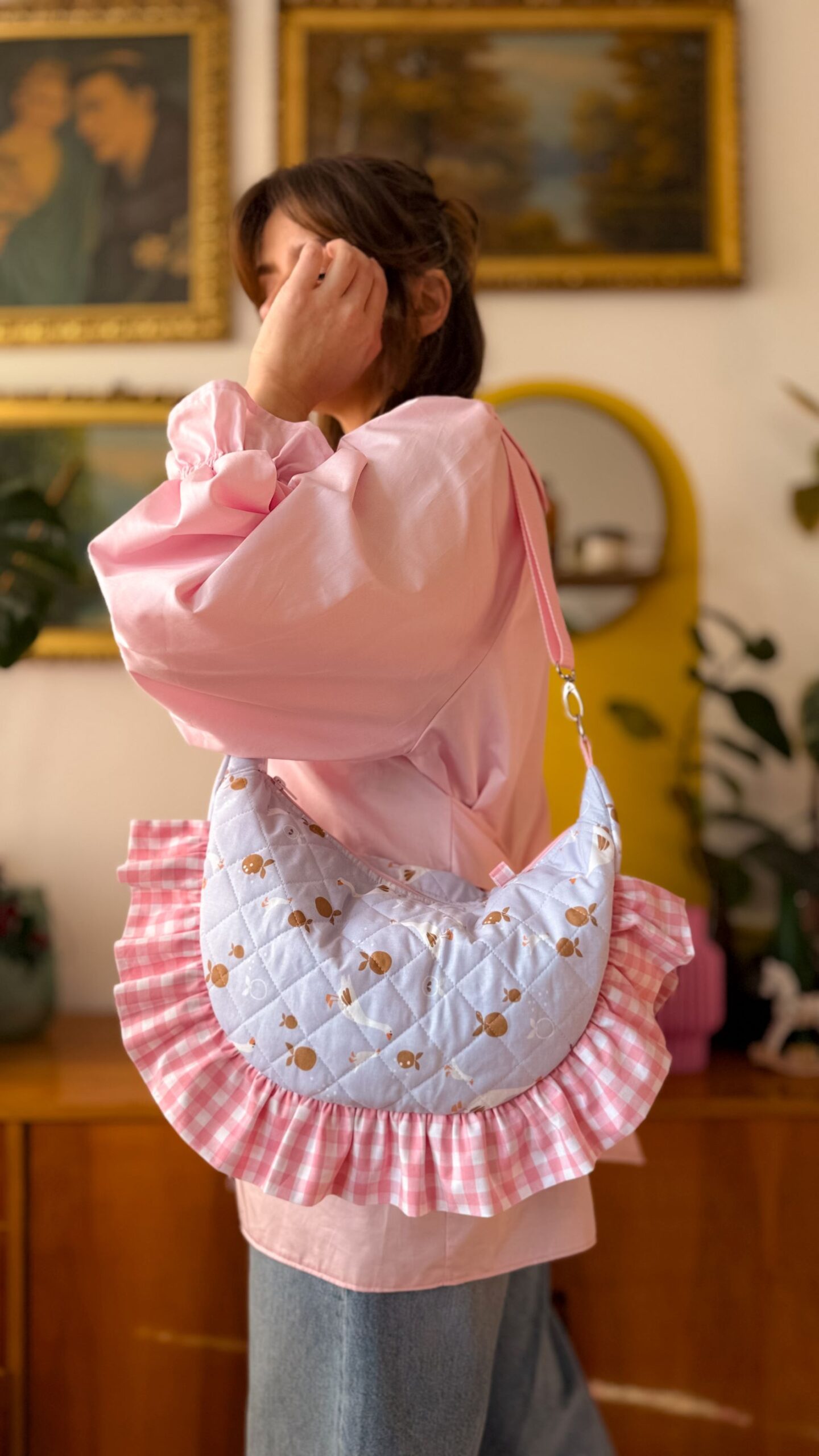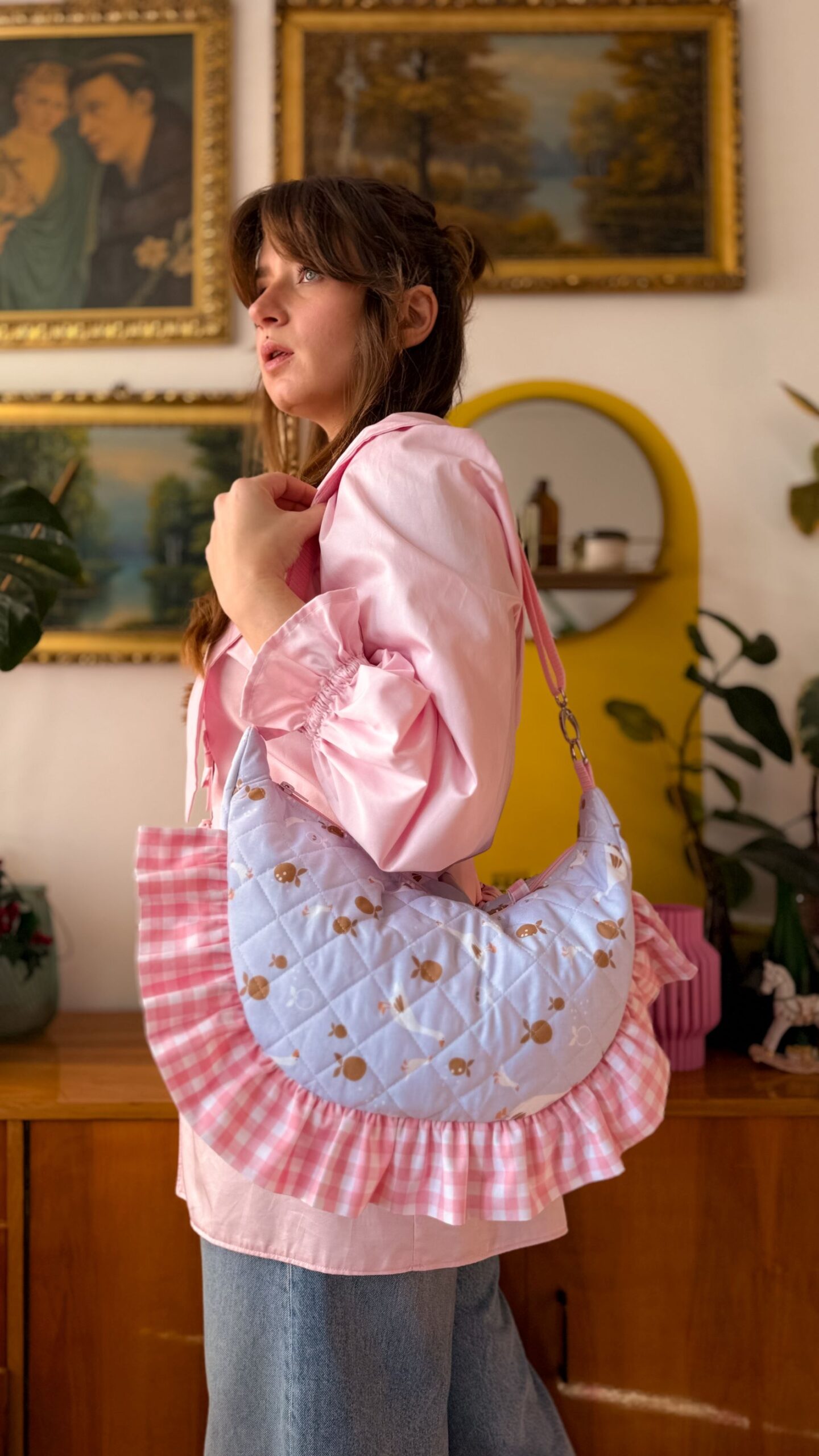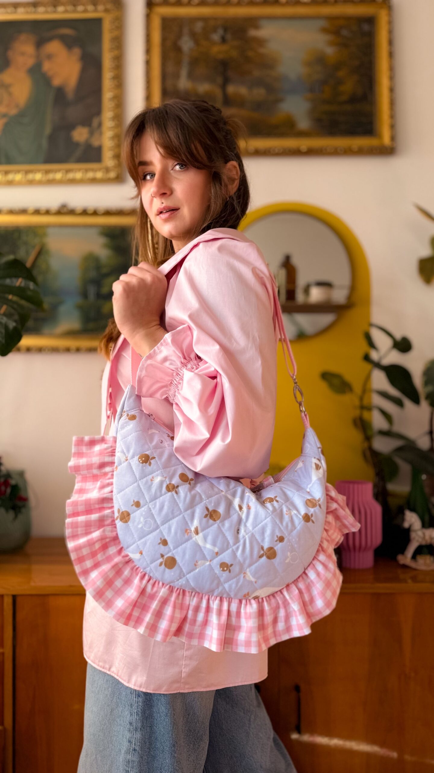 Niewątpliwym atutem tej torebki są sporych rozmiarów falbanki w różową kratkę.